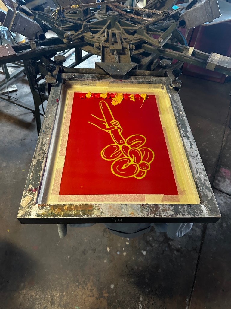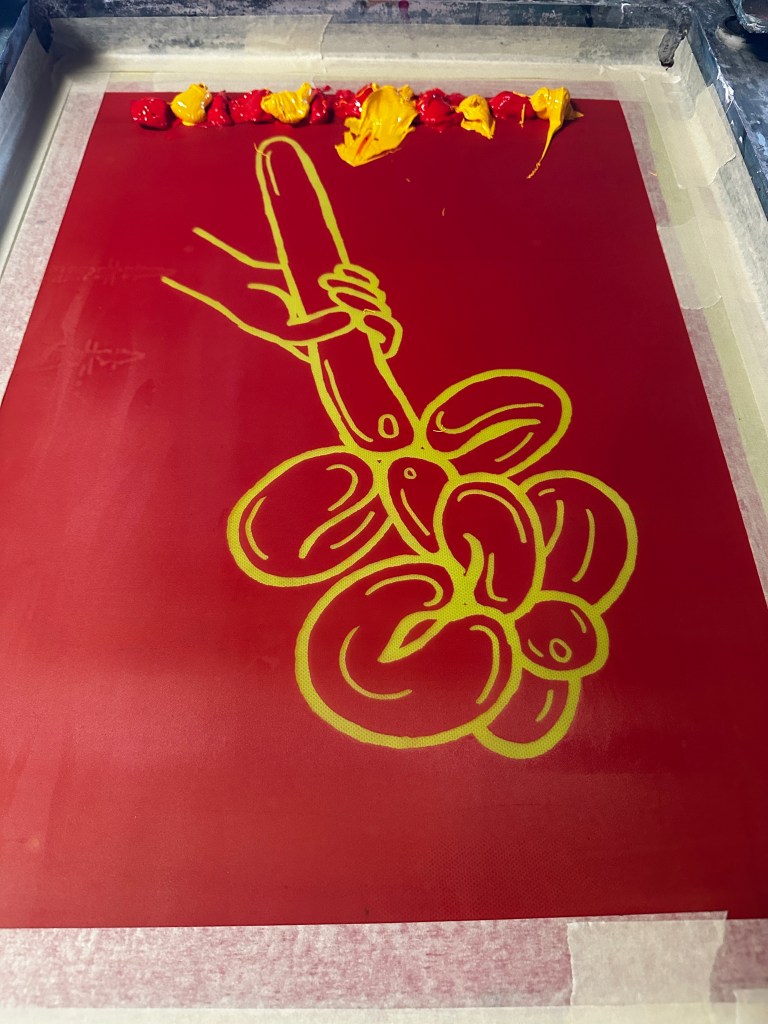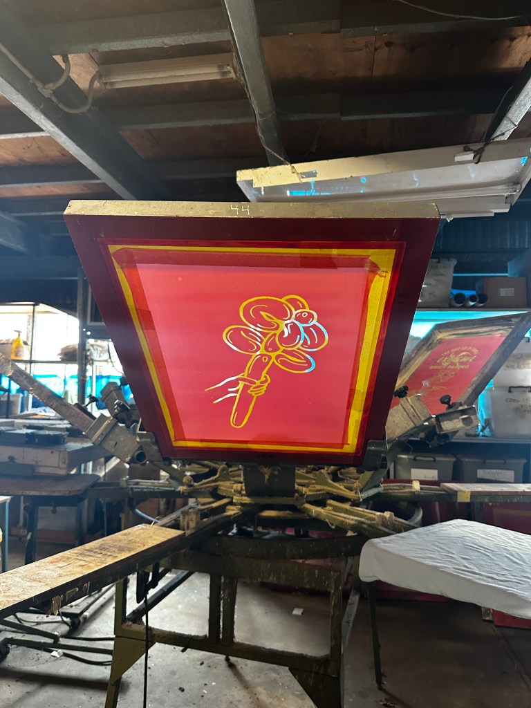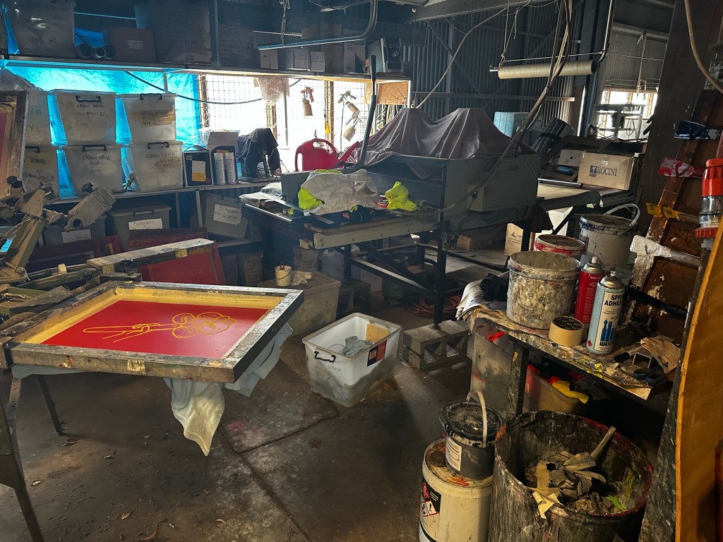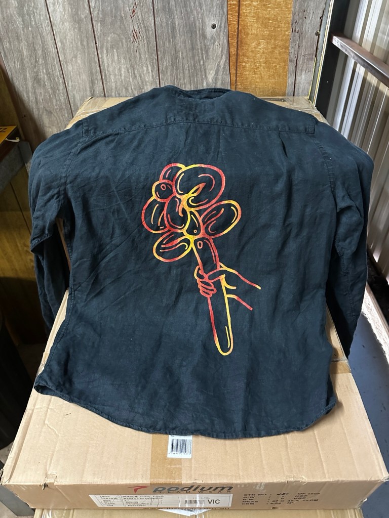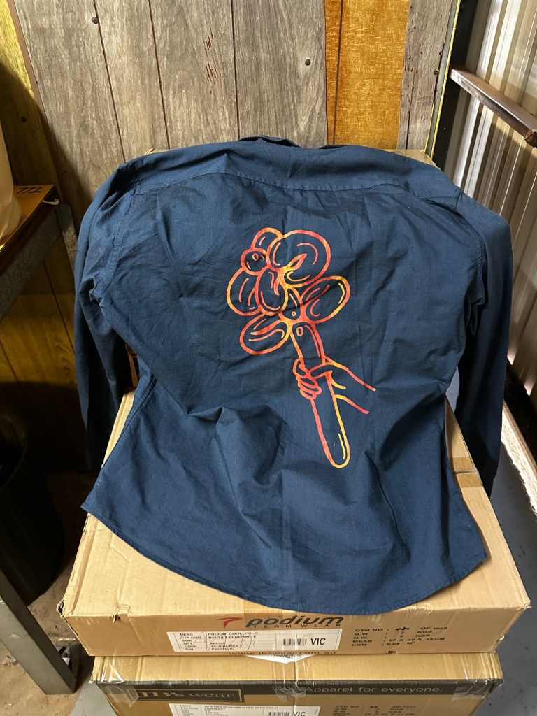 The job turns out to be a whole lot more interesting than I thought it would be. Assisting in a creative process, I’m not used to the commercial environment, but it is business as usual really. Pulling in sets for the Australian Ballet one gig, then fighting off monkeys in a circus next, then screen printing t-shirts in a workshop; I’ve got university qualifications in this process! Now I’ve started on my own line; oppshop shirts with the balloon flower print $45 each at the markets next year.