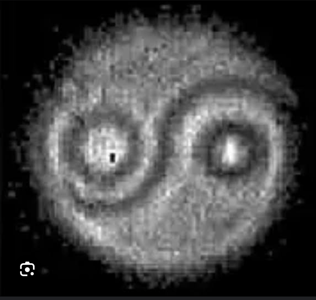 Ghost images are obtained by correlating the output of a single-pixel photodetector, which collects light that has been transmitted through or reflected from an object, with the output from a high spatial-resolution scanning photodetector or photodetector array whose illumination has not interacted with that object. The term “ghost image” is apt because neither detector’s output alone can yield an image. The photodetector has no spatial resolution, while the high spatial-resolution detector has not viewed the object. The first ghost imaging experiment relied on the entangled signal and idler outputs from a spontaneous parametric downconverter and hence the image was interpreted as a quantum phenomenon. Subsequent theory and experiments showed, however, that classical correlations can be used to form ghost images. And they make Ying-Yang patterns which is kind of cool. To find an ancient symbol of fundamental forces, opposites working in unity, present in an accurate and detailed scientific representation of a fundamental form. Ancient symbols of wisdom found in modern scientific technique; and they say creation has no intrinsic meaning?